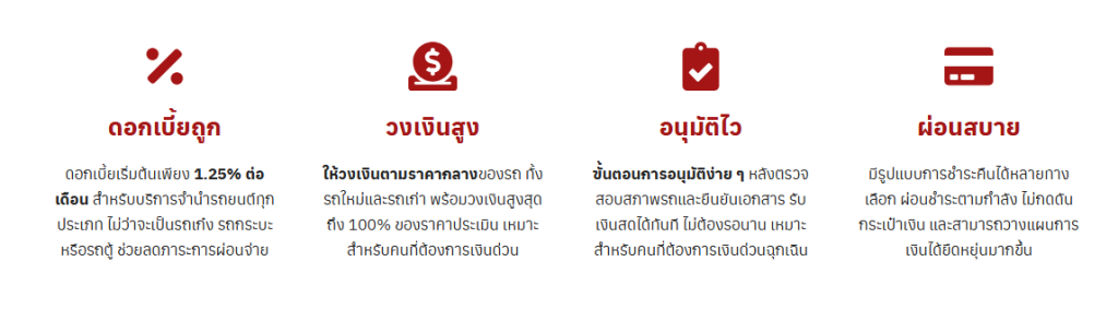 • ความรวดเร็ว ผู้ใช้ส่วนใหญ่บอกว่าการทำเรื่องจำนำรถจอดใช้เวลาเพียงไม่กี่ชั่วโมง หลังตรวจเอกสารและสภาพรถก็สามารถรับเงินได้ทันที